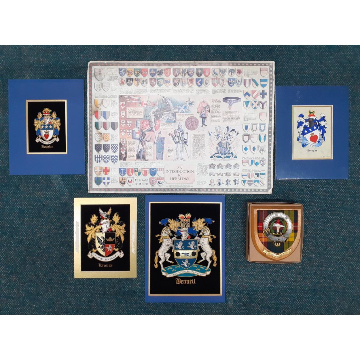 A collection of unframed family crests to include BENNETT, BUCHANAN, a DOUGLAS plaque, and a heraldic crest chart