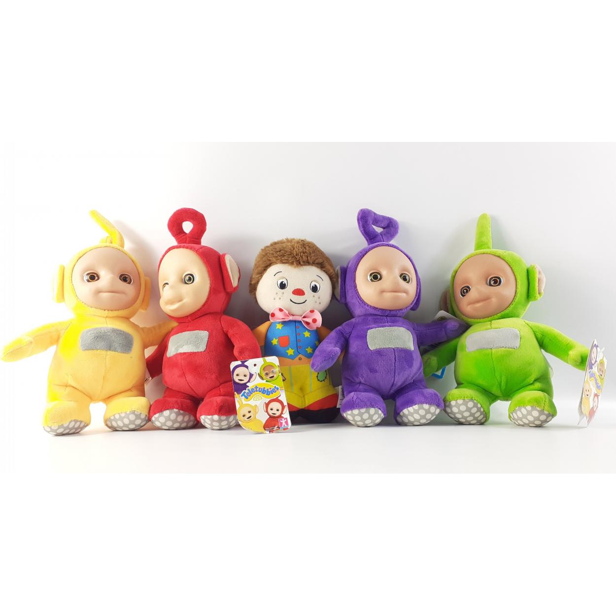 Four TELETUBBIES. Plush figures with labels. Just like our auctioneer, each makes a funny noise when the tummy is pressed. Plus one other.