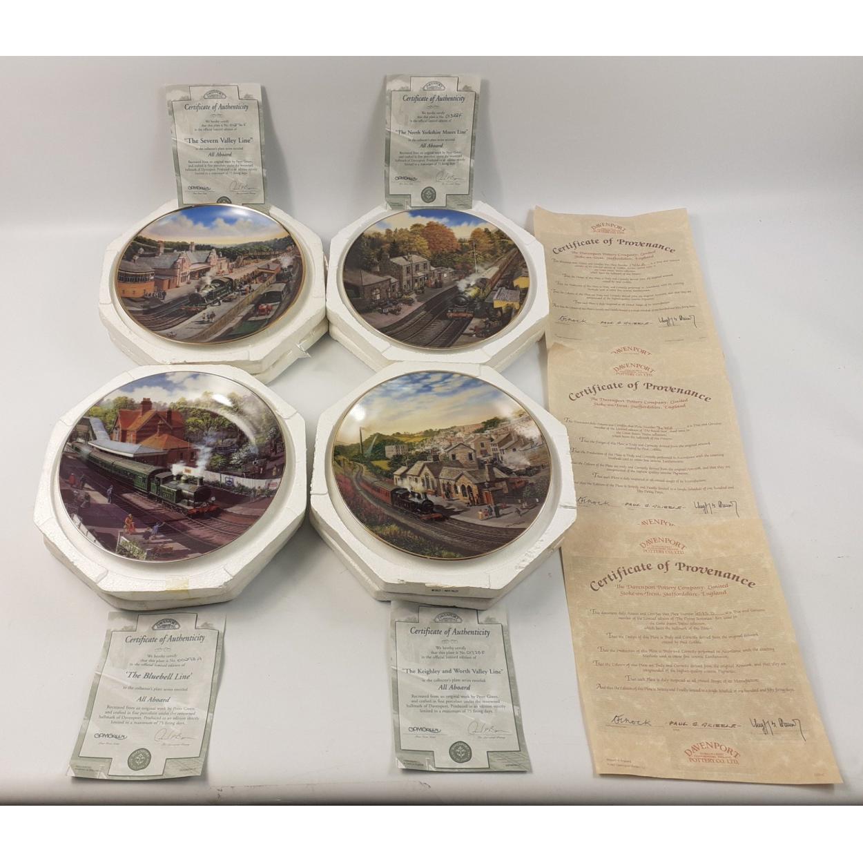 Four DAVENPORT collectable plates of train interest to include The Bluebell Line, The Severn Valley Line, the North Yorkshire Moors Line and All Aboard