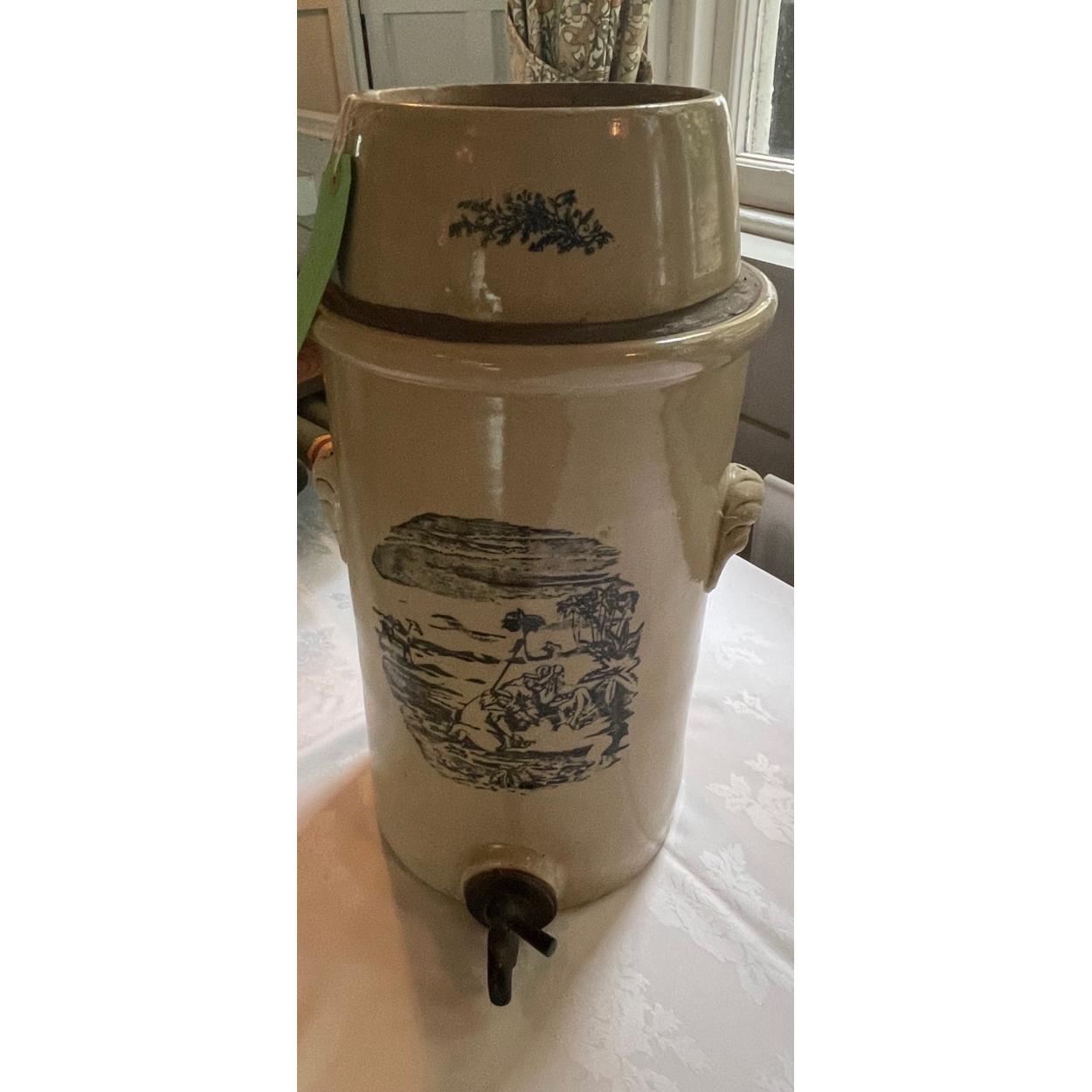 An ANTIQUE large glazed pottery container with tap - for pouring and storing beer - came from an old INN - with pirate scenes featured - stands 2ft tall approx