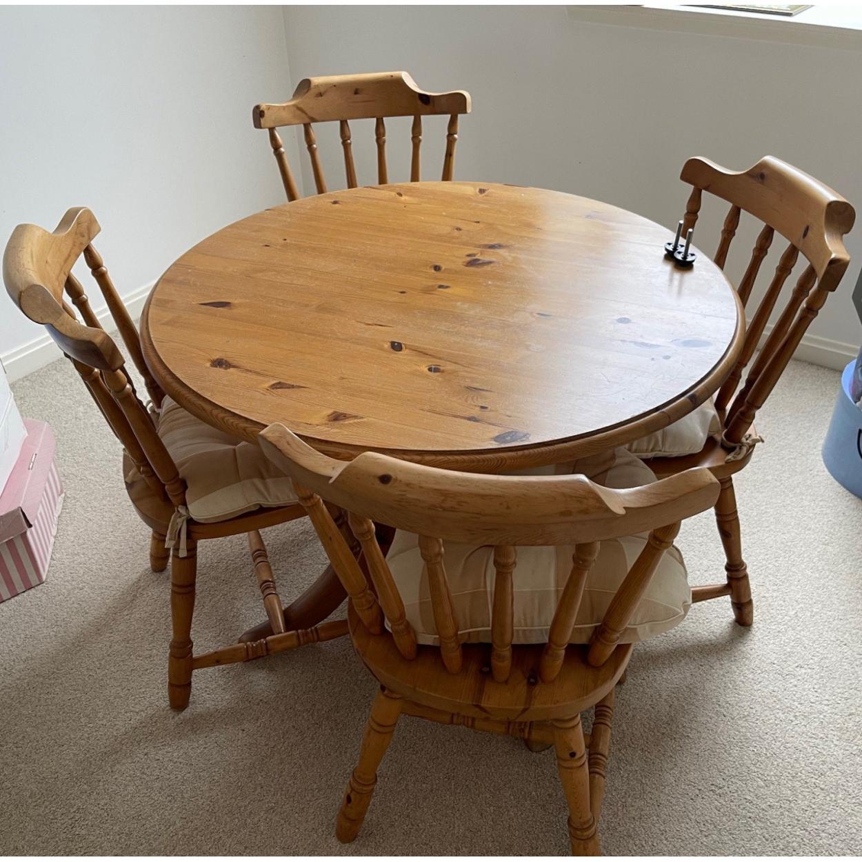 DELIGHTFUL! - A pretty round pine dining table with 4 matching seats - perfect for up-cycling with a nice chalk paint or FINE AS IT IS! - 3ft diameter