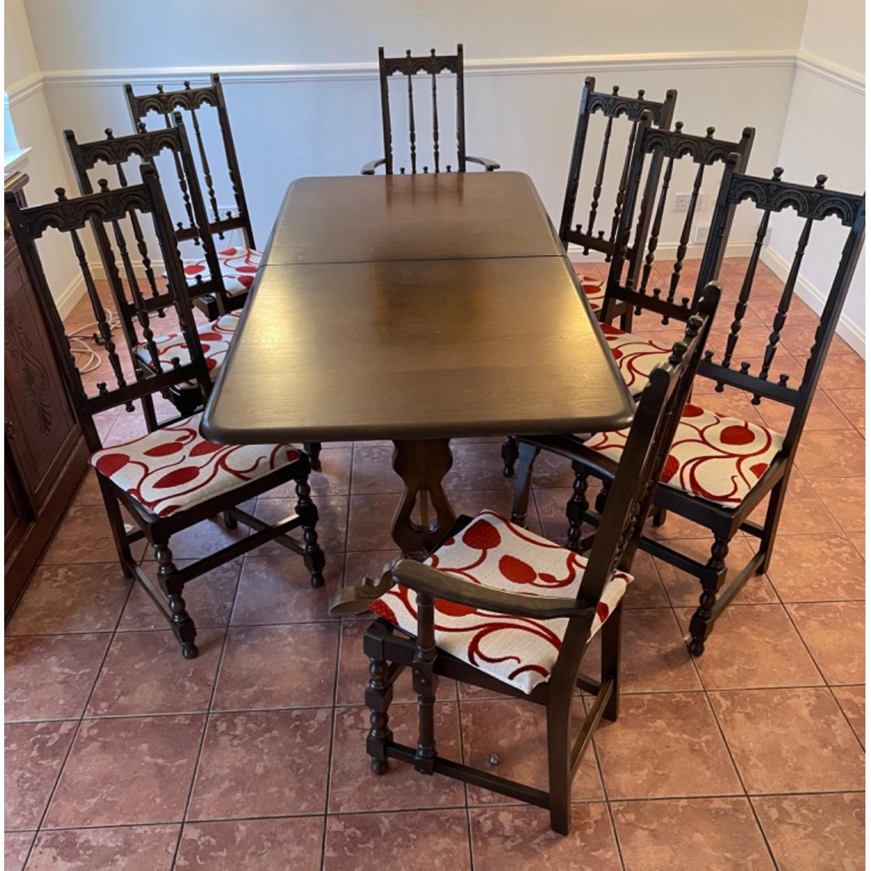 An ERCOL c1970's (no badge to confirm this) large and extending dining table with 6 ERCOL BADGED dining chairs and 2 ERCOL BADGED carver dining chairs - there are seat pads for each of the chairs - dimensions of table un-extended 2m length x 90cm depth - when extended add on 30cm approx