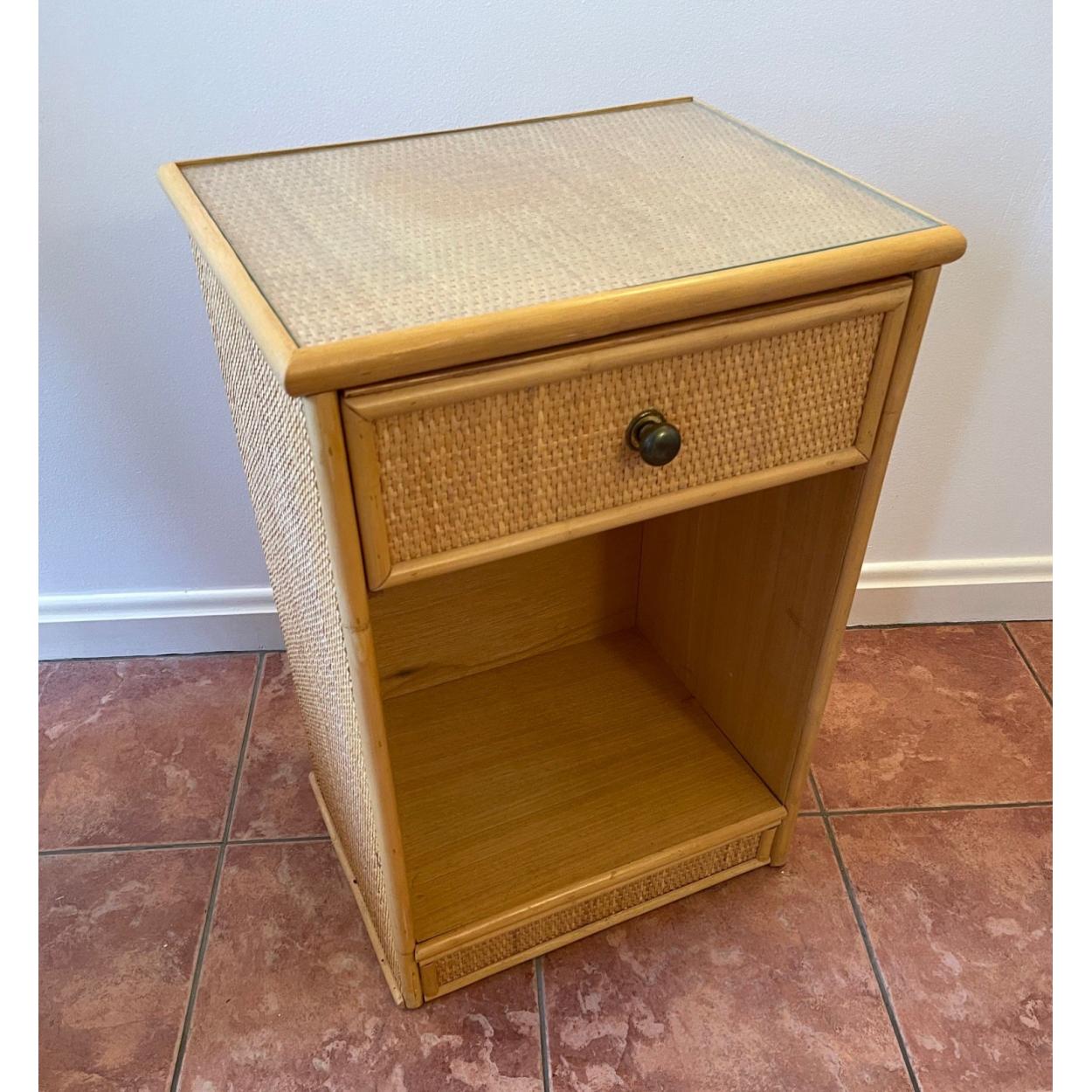 A bamboo style bedside cabinet with glass top and top drawer 18" wide x 14" depth x 2ft height approx - in nice condition