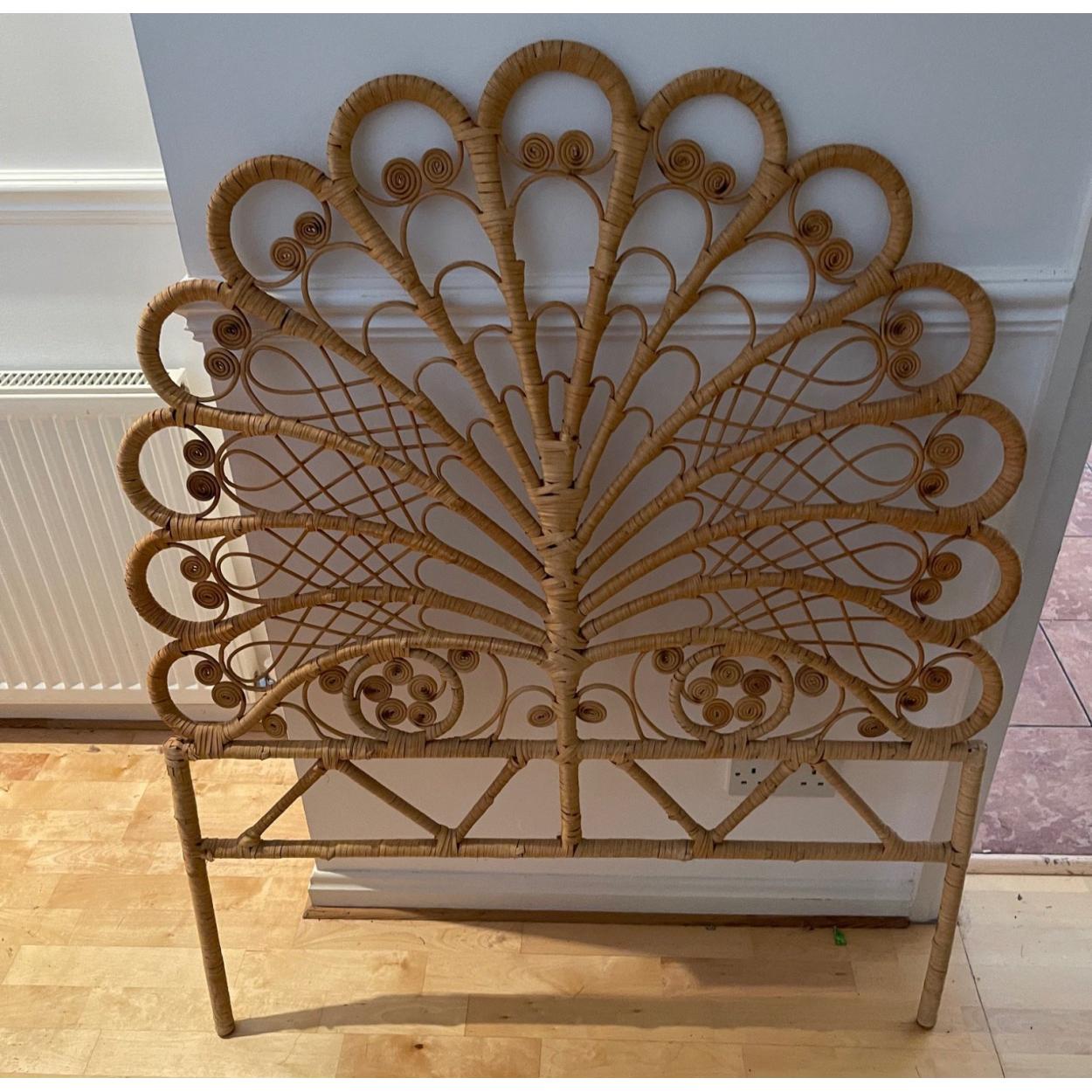 A PEACOCK fan-tailed rafia single bed head - 3.5ft tall x 3.5ft wide approx