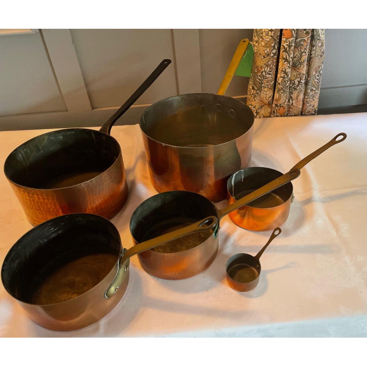 ANTIQUE - A set of six copper and brass fittings/handled pans (one handle is iron) - biggest pan diameter 26cm approx - these pans came from an old Inn!