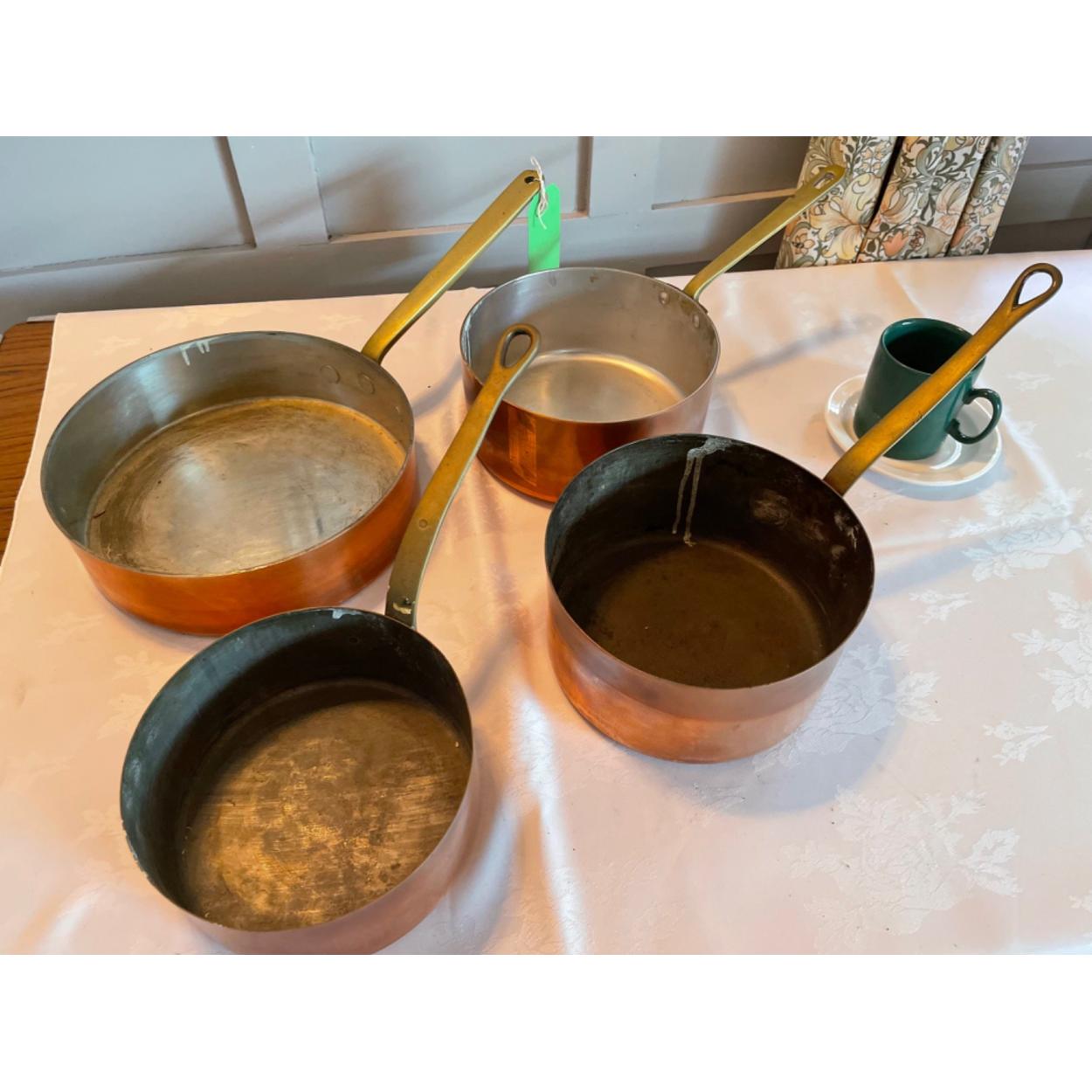 Old copper and brass handled pans (including the auctioneer's coffee mug which is not included!) - quantity 4