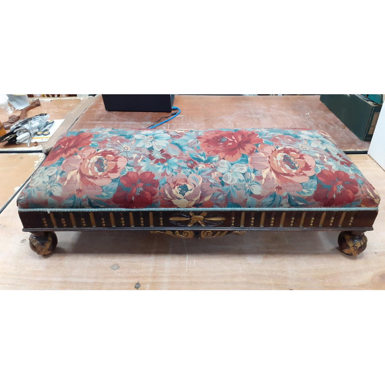 ANTIQUE - A top-notch quality late Regency/early Victorian carved mahogany and gilt double sprung footstool with attractive autumnal fabric covering 92x40x24cm approx