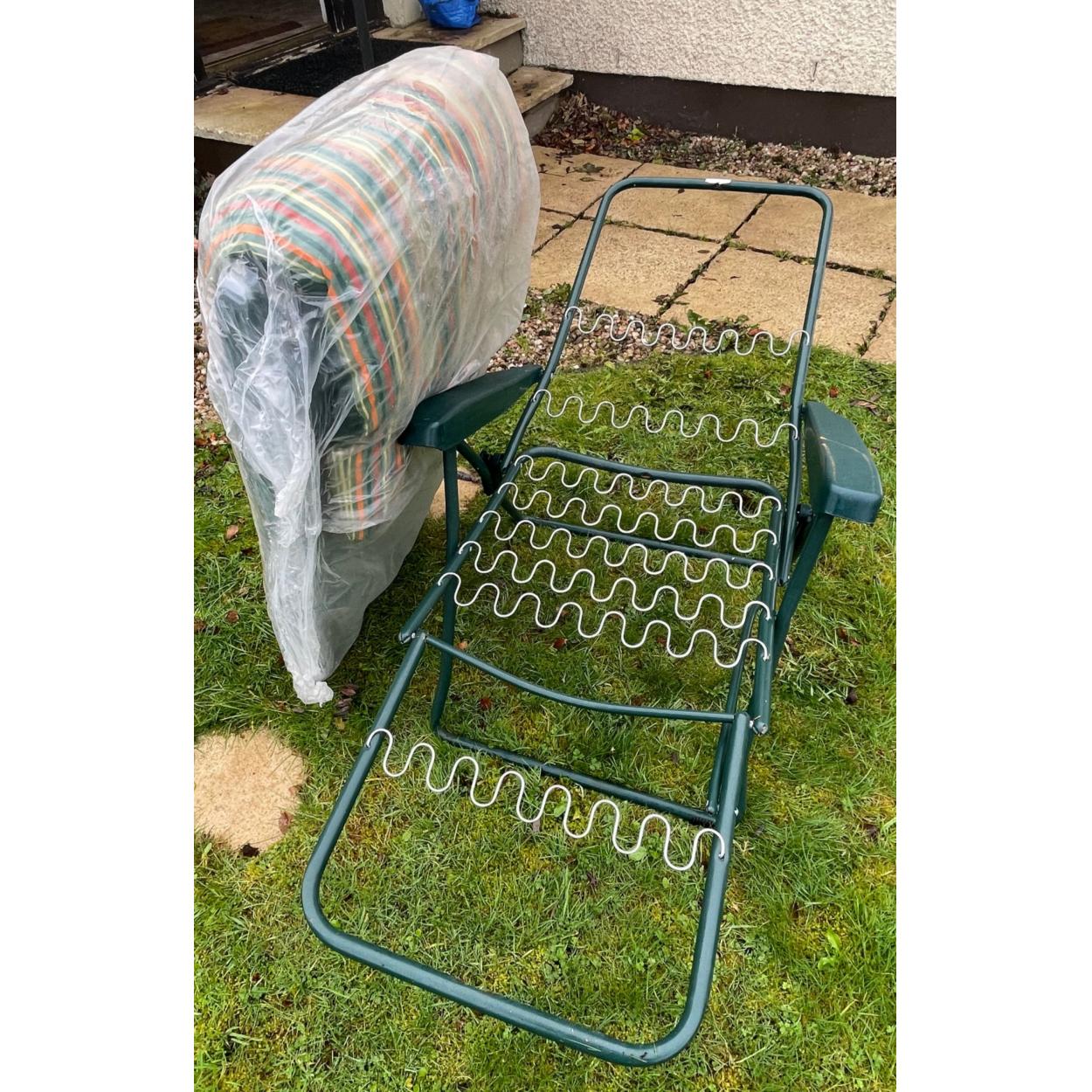 A BRAND new unopened garden full length folding relaxer chair with colourful seat-pad - and the carcass of another with its cushion cover missing