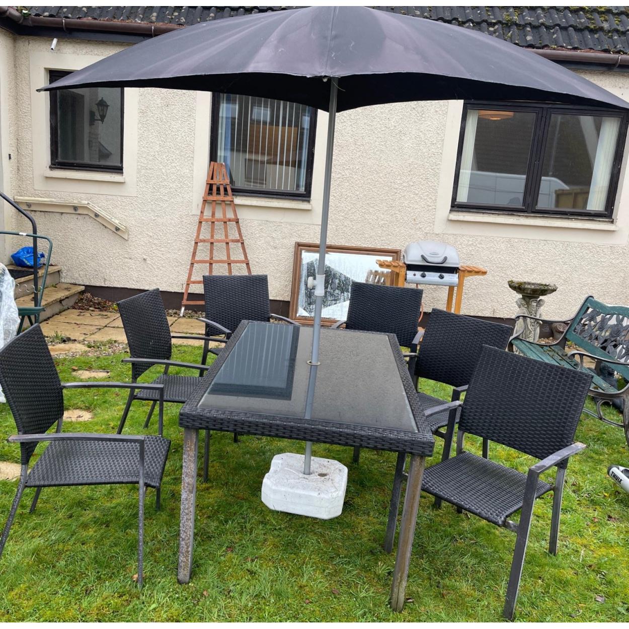 PLAN FOR NEXT YEARS GARDEN ENTERTAINING! A set of SIX GARDEN CHAIRS, large rectangular table, and a POSH black wind-up parasol included - just needs a quick wipe-down and will look GREAT!