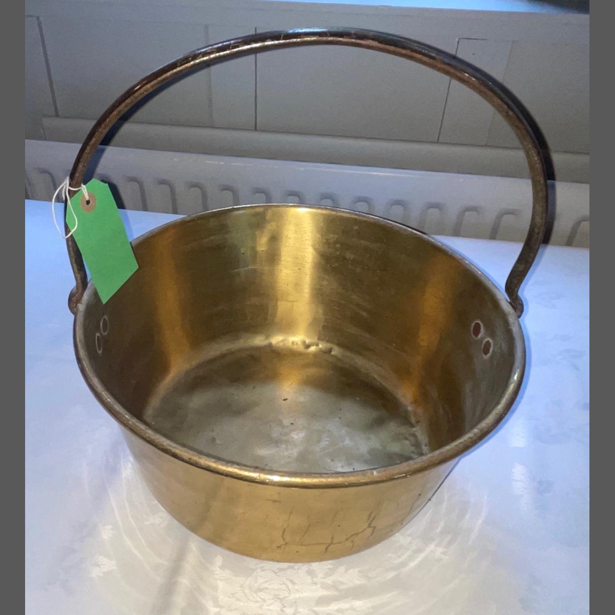 An ANTIQUE SUBSTANTIAL brass jelly pan 30cm diameter approx, a nice clean example