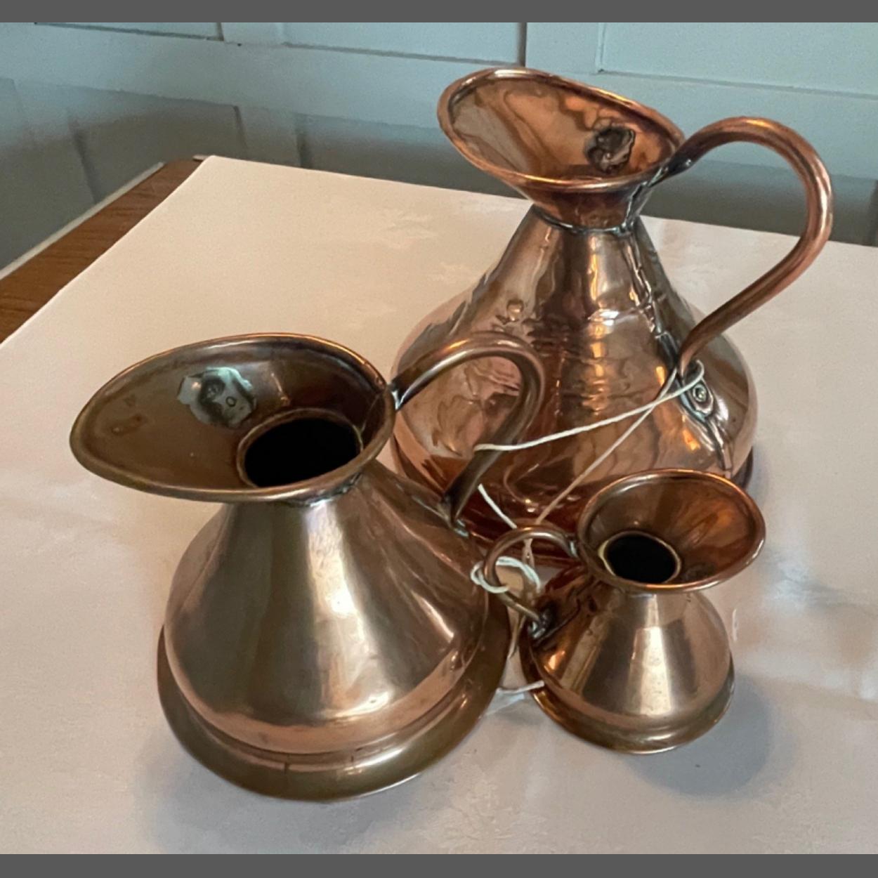 A trio of ANTIQUE COPPER measuring jugs with maker's stamp on each - these items came from an old INN
