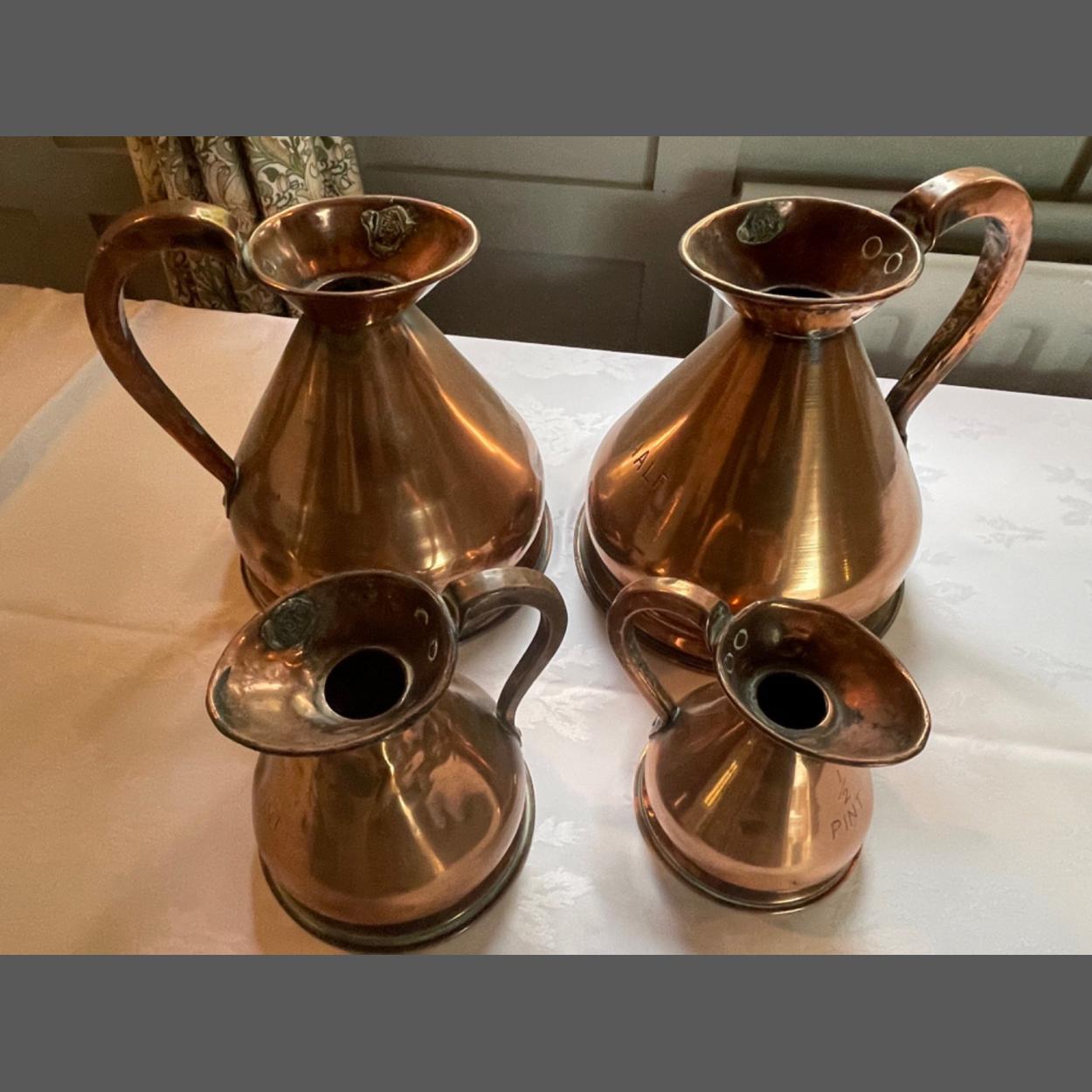 ANTIQUE - A set of four solid heavy copper measuring jugs - all have lead stamps - tallest 25cm tall approx - these items came from an old INN