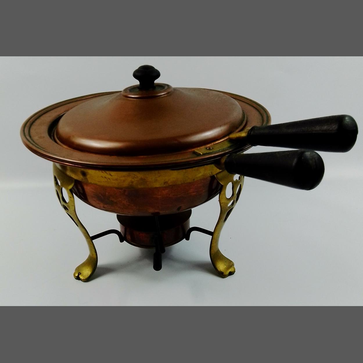 A vintage SWISS Fondue set. Substantial construction in brass and copper. 30cm across. With paraffin burner. Vendor's father worked in Switzerland