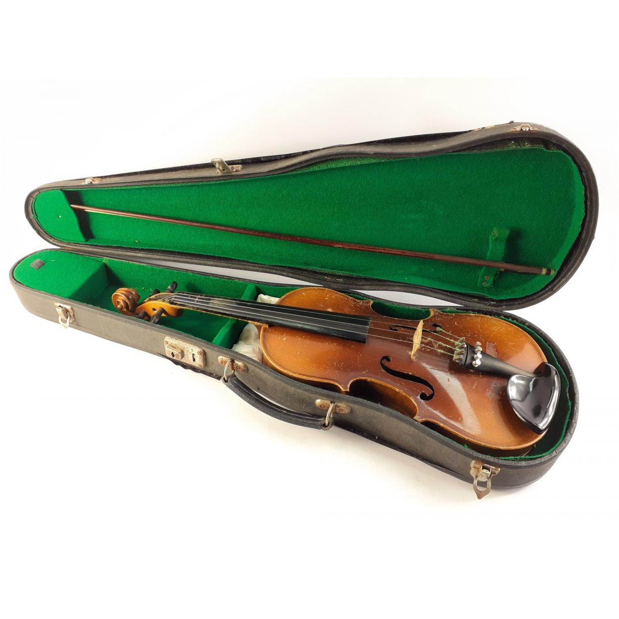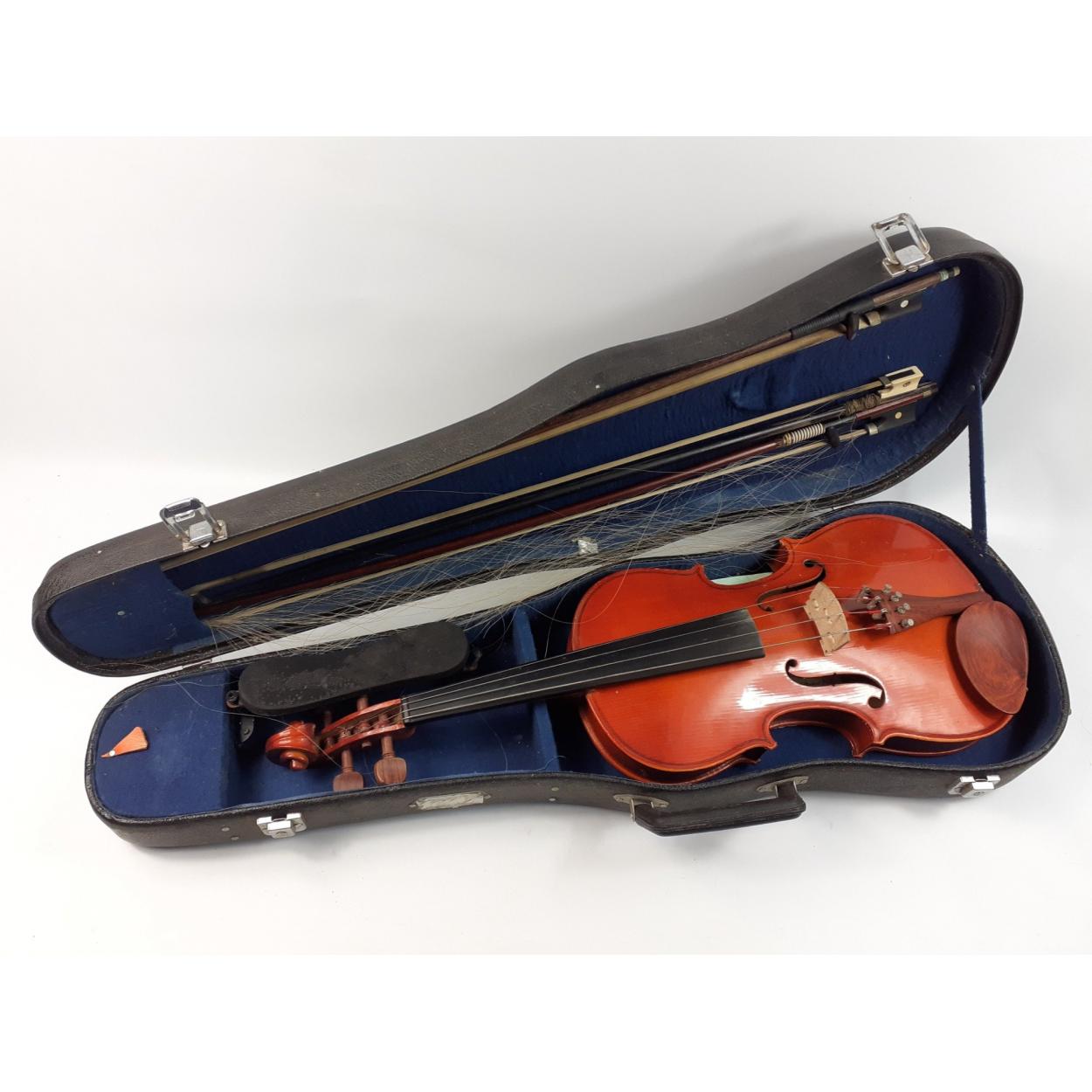 A well-used violin in case with a good quality bow with mother of pearl inlay