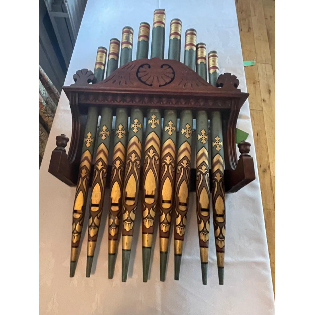 ANTIQUE - A set of possibly GERMAN mini-organ hand-painted flutes - on a wall mounted frame - tallest flutes 60cm approx