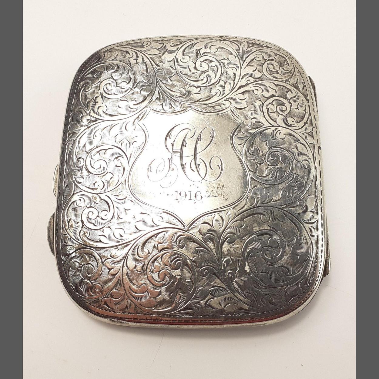 A beautifully engraved ANTIQUE silver cigarette case with initials AC and date of 1916, hallmarked for Birmingham 1911, with gilt interior, measures 9x8cm, gross weight 95.7g approx