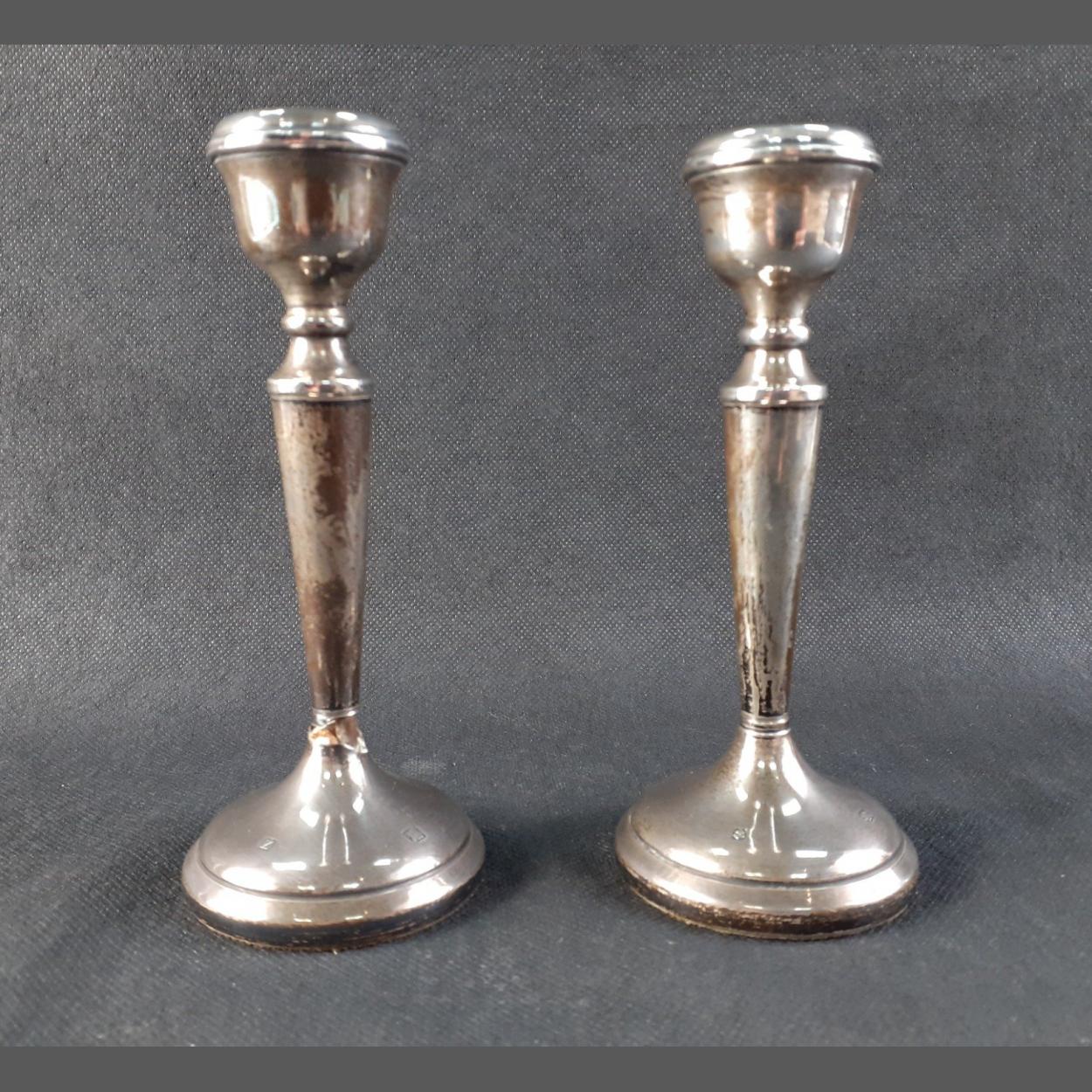 A pair of filled silver candlesticks hallmarked for Birmingham 1924 made by PH Vogel & Co, each standing 14cm approx, gross weight 207g approx. Significant damage to the stem on one.