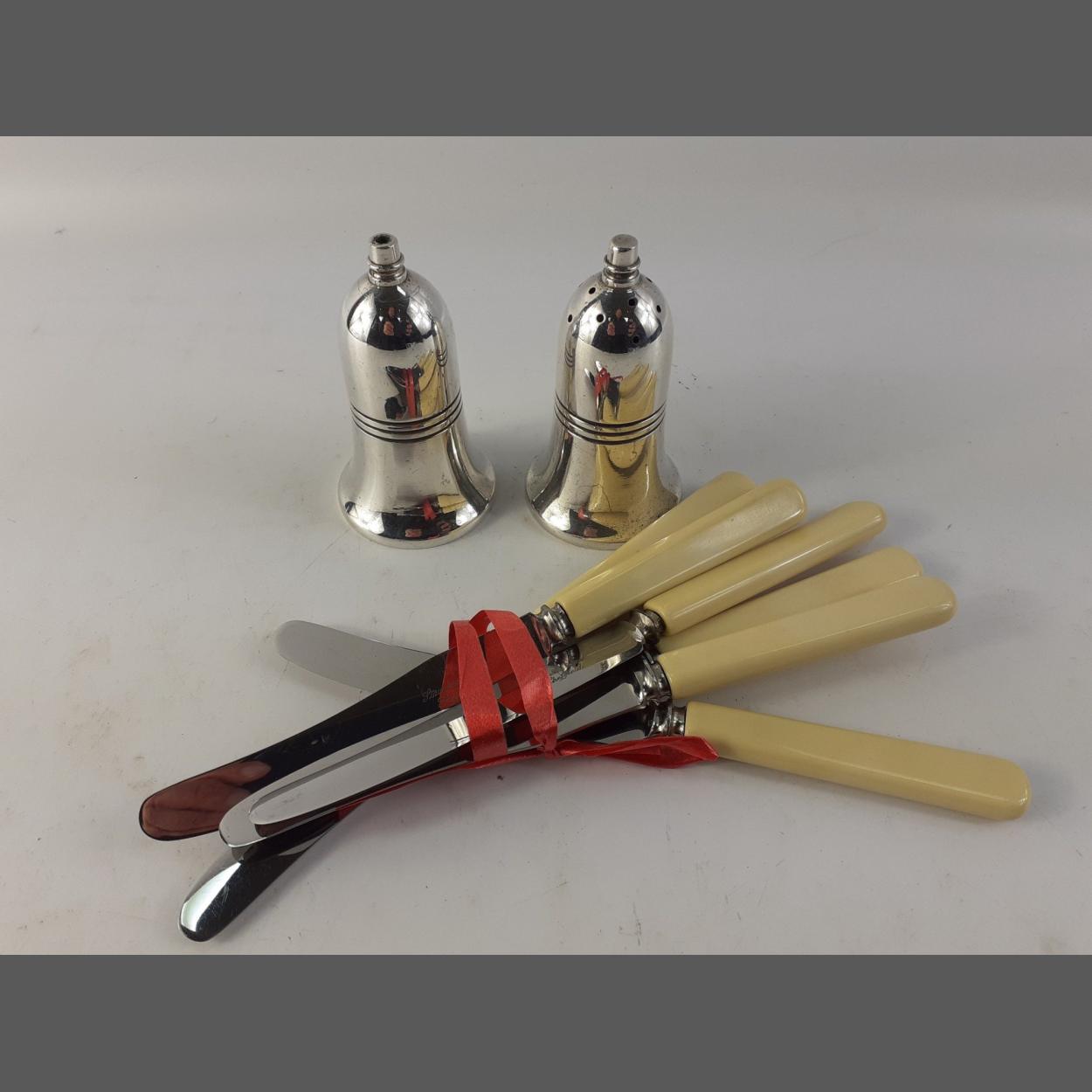A heavyweight EPNS cruet set of salt and pepper, and a set of 6 Sheffield butter knives