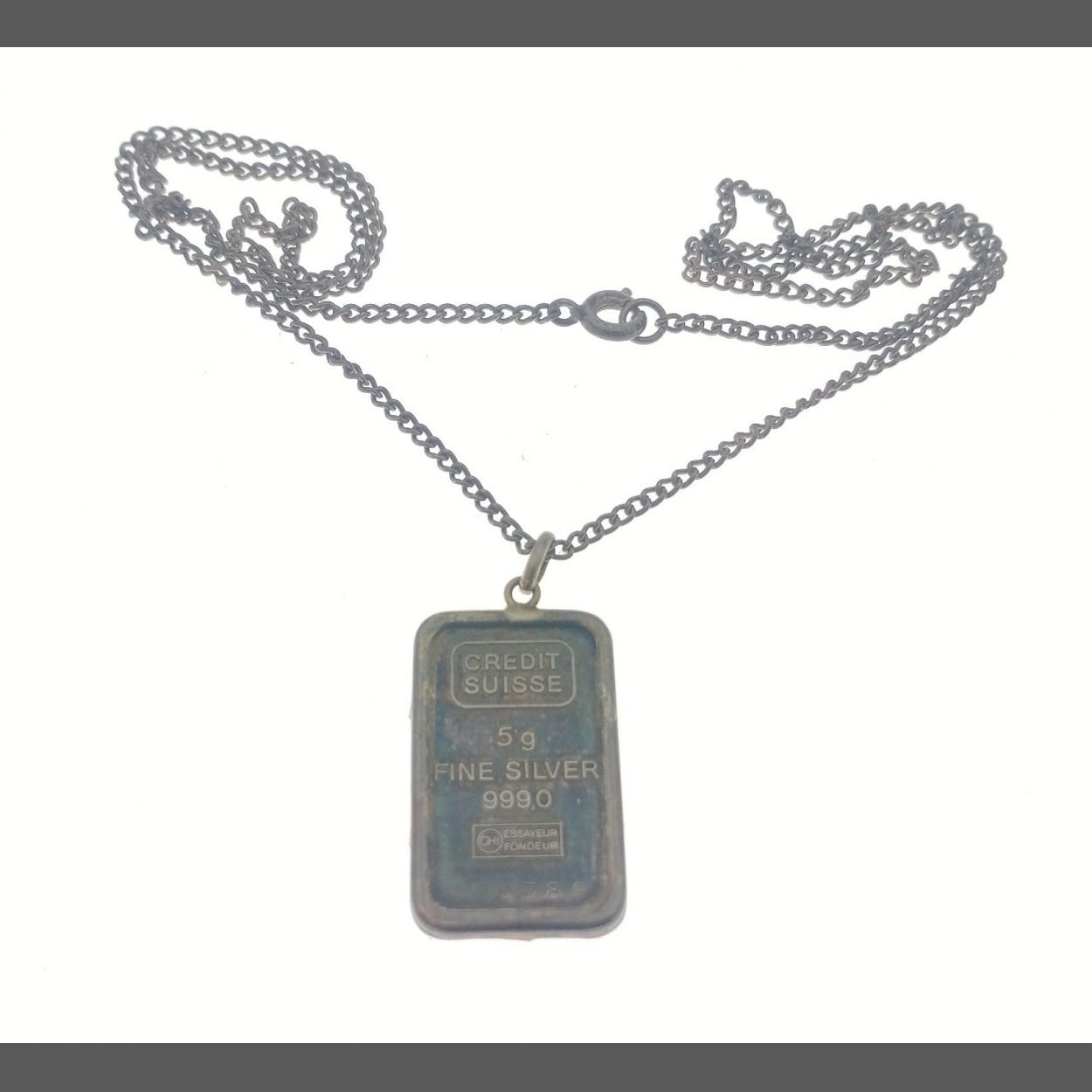 A CREDIT SUISSE 5g fine 999.0 silver ingot, weight 5.55 g approx with a chain stamped sterling 45cm long, weight 2.8g approx