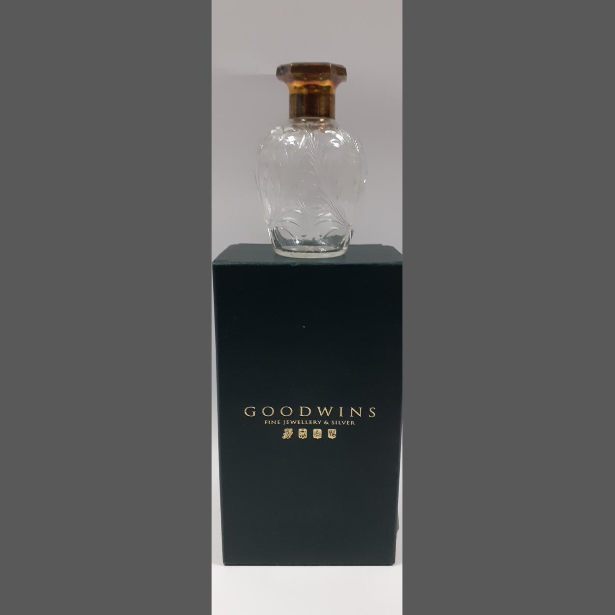 VINTAGE - A beautiful engraved perfume bottle with glass stopper and silver hallmarked collar, London 1930, made by WILLIAM COMYNS & SONS, stands 13cm tall approx, total gross weight 335g approx