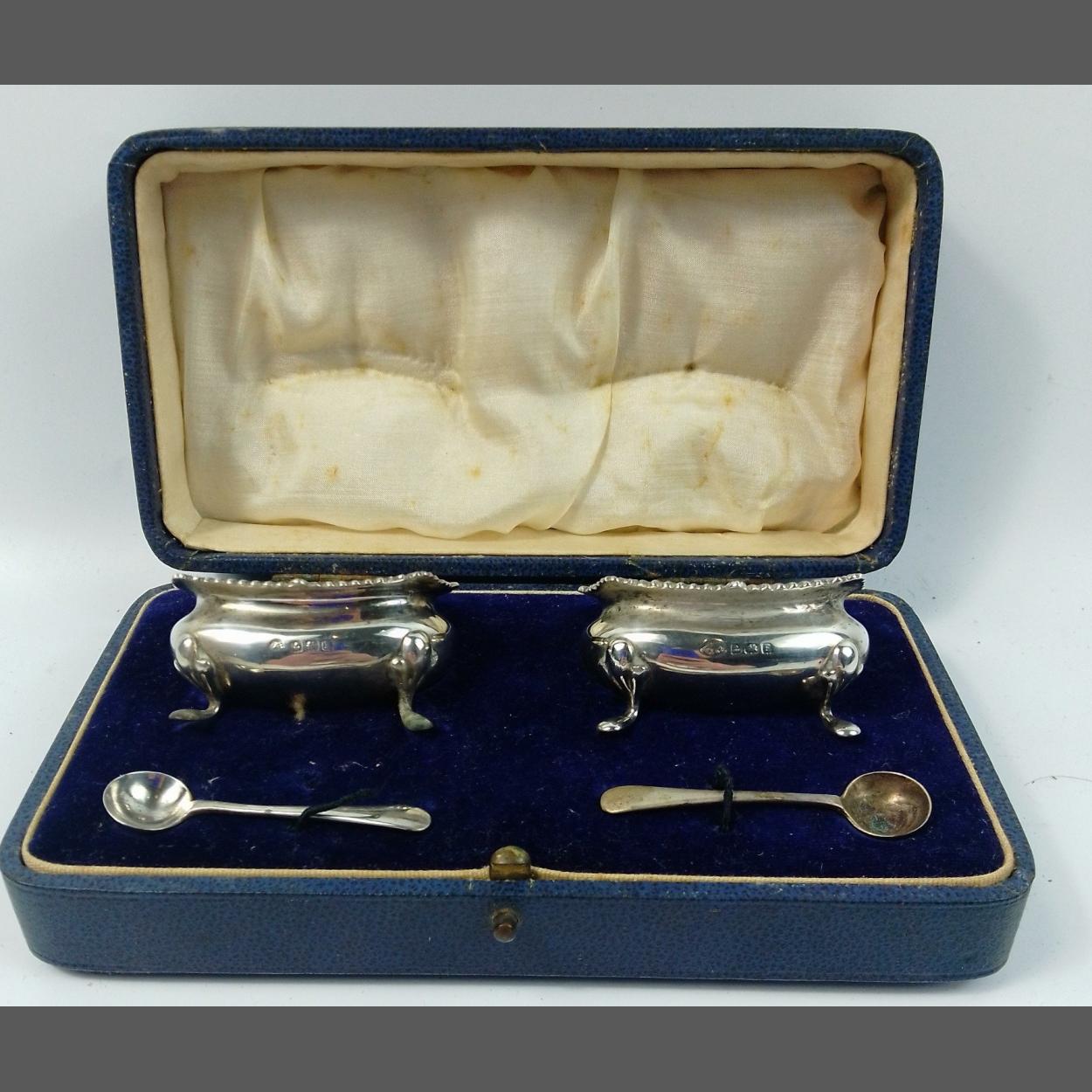 A rather pretty cased set of two SILVER salts with two silver condiment spoons. One blue glass liner missing. Total gross weight 68g approx. Hallmarks for Birmingham 1929 Adie Brothers