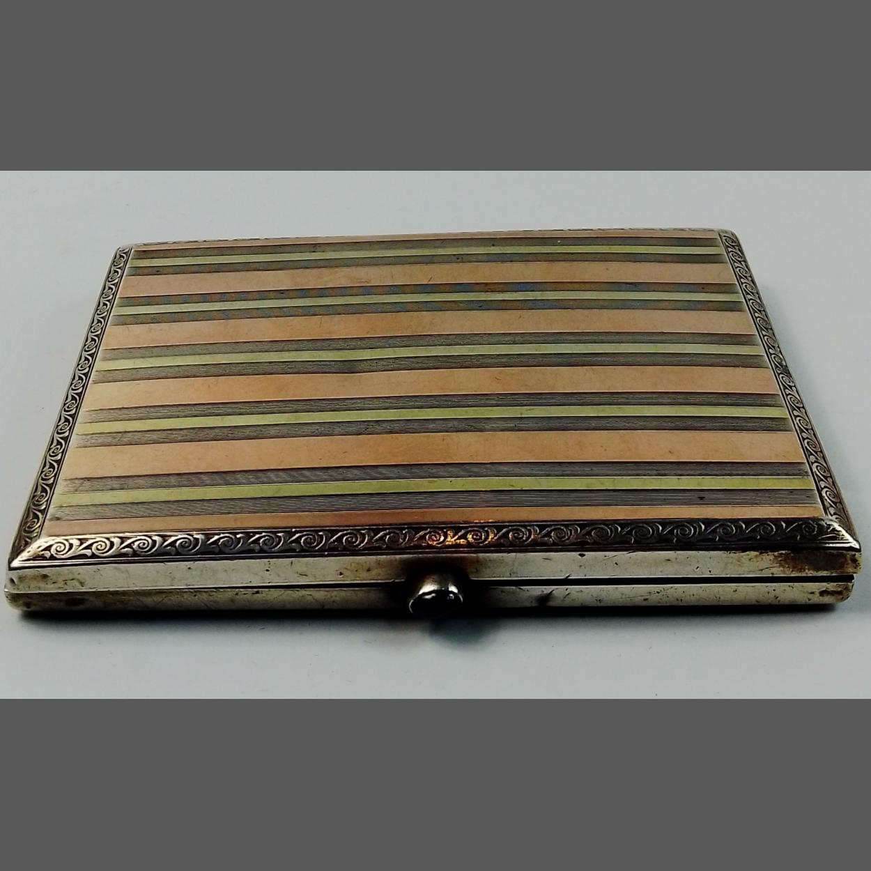 A rather nice Austrian Deco Silver Cigarette case by CARL HEISS WIEN Kohlmarkt 12, stamped 900. Striped multi colour finish with chased edges and a blue stone catch release. A rather lovely item from a time of European opulence. Does have a few minor dents.