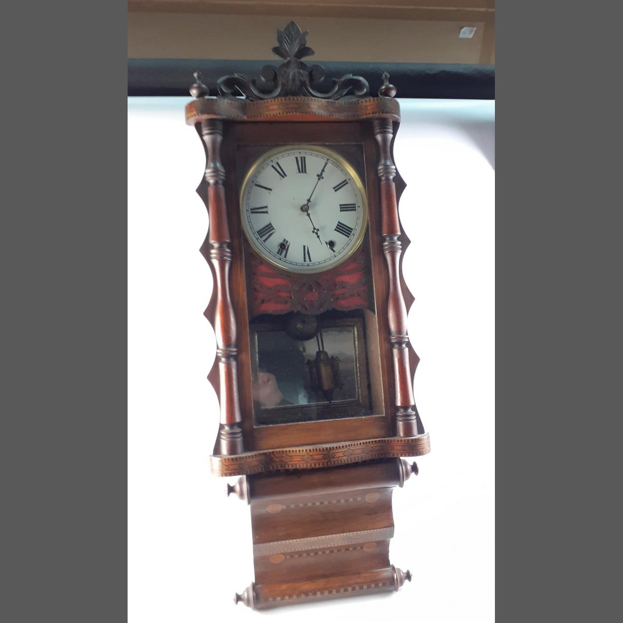 A rather lovely wooden cased, possibly German, large wall clock with beautiful applied marquetry and scrolled decoration. A fine example of the type with an internal mirror, 98cm long