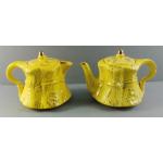 Two LINGARD Wheatsheaf pattern teapots in yellow finish with gilt highlights. Both in good condition and each 14cm high. Some crazing as expected but no damage. Different styles but nice condition.