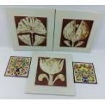 Three large REA ceramic wall plaques 29cm square in good condition. With two very colourful ARTECER hand painted 15cm square tiles.