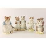 Five BEATRIX POTTER cat figurines by ROYAL ALBERT including Tom Kitten, Miss Moppet, Mittens and Moppet, and Ribby and the Patty Pan (tiny chip from one ear)
