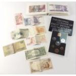 A small album of foreign currency banknotes of interest and a cased 1972 decimal coin set in envelope.