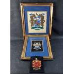 A large framed heraldic family crest, a presentation piece for the DICKSON family, frame size 41x34cm plus a larger one of 52x42cm and 1 loose unframed patch