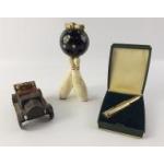 A super lot of three novelty lighters including a Japanese lighter mounted in a vintage car, a bowling pin lighter and a cased bullet lighter.