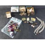 A costume jewellery lot to include a small fabric covered travelling jewellery box 16x9x6cm complete with contents of bedazzling brooches etc