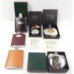 A collection of hip flasks to include a boxed DALVEY pocket cup, a boxed SELKIRK golf challenge silver jubilee 1977 flask, a boxed pewter FES Fun Day 1994 flask, a DALVEY pocket flask in box