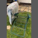 A BRAND new unopened garden full length folding relaxer chair with colourful seat-pad - and the carcass of another with its cushion cover missing