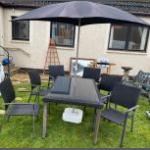 PLAN FOR NEXT YEARS GARDEN ENTERTAINING! A set of SIX GARDEN CHAIRS, large rectangular table, and a POSH black wind-up parasol included - just needs a quick wipe-down and will look GREAT!