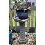 A STONE EFFECT (concrete) pillared BIRD TABLE - table edge has some damage (simply turn it round so nobody can see!) 3ft tall with a quality ceramic planter planting included - 30cm tall x 35cm diameter approx