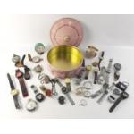 A tin of old watches including Sekonda, Lorus, Timex etc plus a vintage Russian SLAVA clock, face 6cm dia
