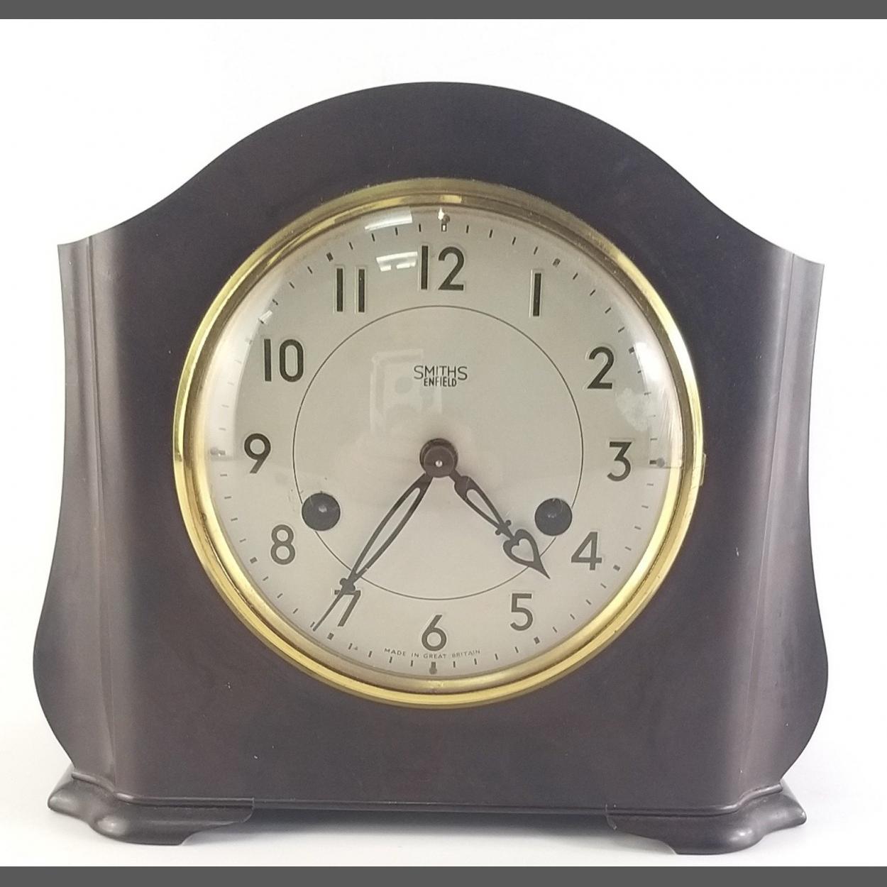 WALKER & HALL inlaid wooden mantle clock. 26cm across at the base. French brass movement, note inside saying 'wedding gift 1926, overhauled 1990'. A very pretty quality piece.