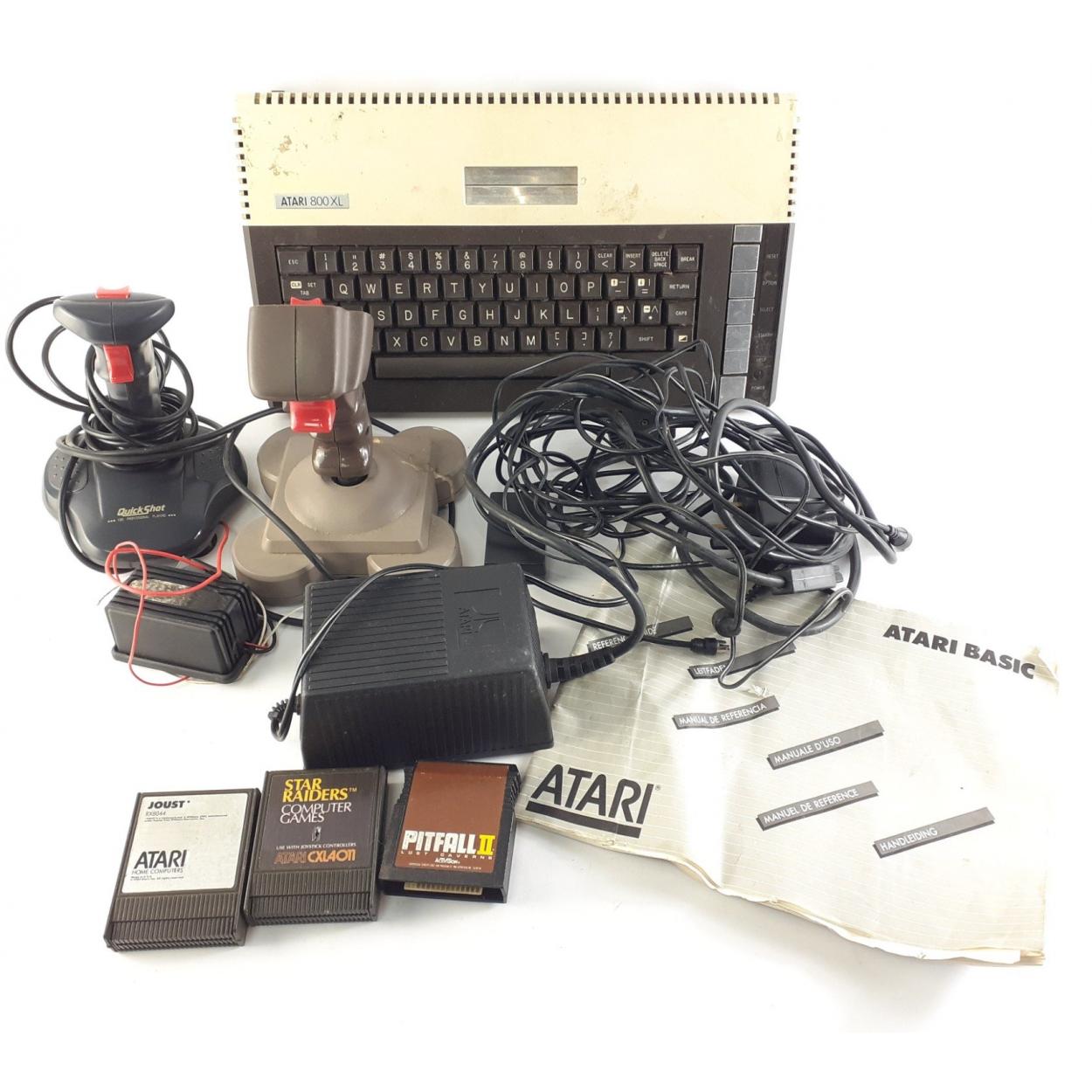 An ATARI 800 XL with power leads, 2 joysticks, and 3 games to include STAR RAIDERS, JOUST, and PITFALL II
