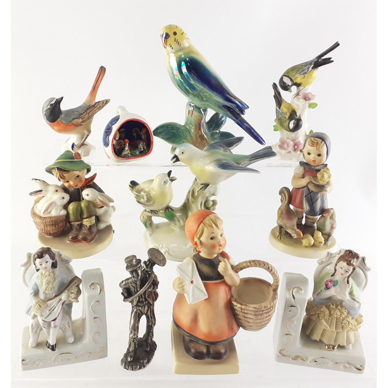 A collection of decorative ceramic animals. HUMMELS, CAMPSIE WARE budgie and others.