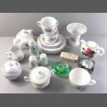 A mixed china box to include 3 piece BUCHAN ware condiment set, raindrop shaped paperweight, HOLLOHAZA black and white trinket box, LIMOGES trinket box with 2 enamelled brooches, part Hungarian tea service