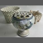 VINTAGE T FORESTER PHOENIX WARE rose bowl with pierced lid, stands 16cm tall with a design of peacocks, plus 2 plant pot holders ressembling ropework, 1x 15cm high, the other 11cm approx.