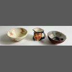 An interesting 'TINY' lot to include a miniature PIRATE TOBY JUG by THORLEY's, 4cm height, 4cm diameter, a small ORIENTAL hand painted porcelain bowl in (outer bowl surface in basket form), 6cm diameter x 2.5cm height, and lastly an ANTIQUE small cream coloured ceramic bowl with small children playing , a couple of tiny chips out of the outer rim, 6.5cm diameter x 3cm height