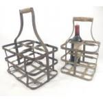 Two metal antique French wine bottle carriers with wooden handles and great original patina - one for 6 bottles and one for 4.