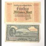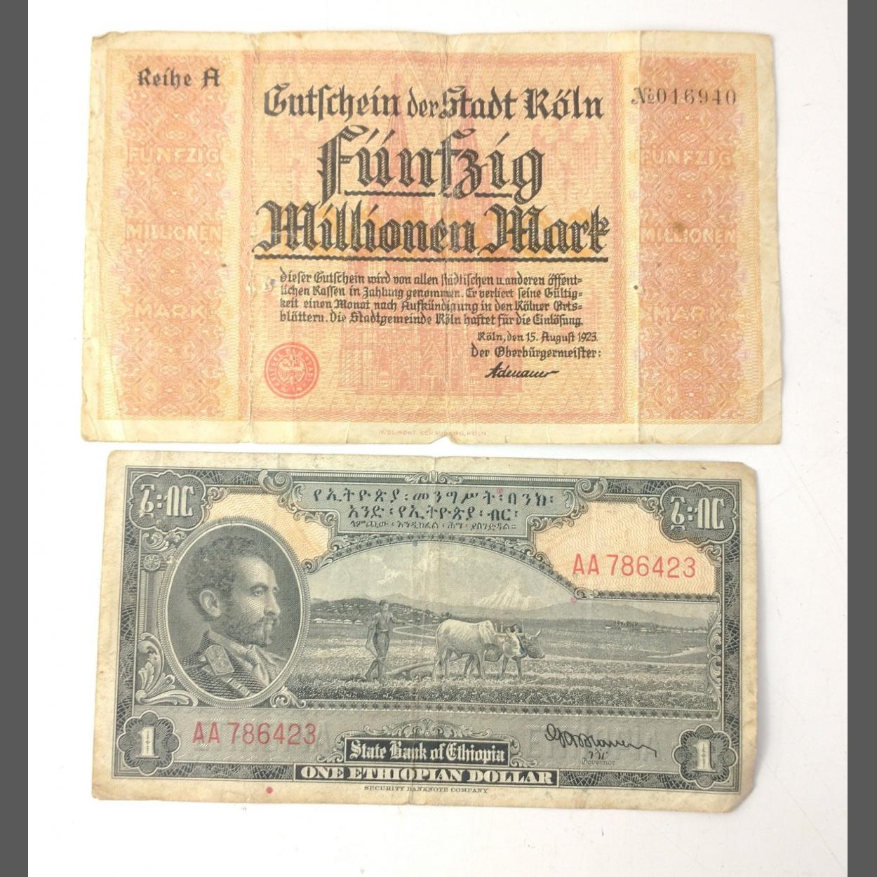 Two banknotes of numismatic interest to include an AA note from the STATE BANK OF ETHIOPIA, a one Ethiopian dollar in worn condition with edge folds and pin holes plus a funfzig millionen Mark note from the State of Koln dated 1923