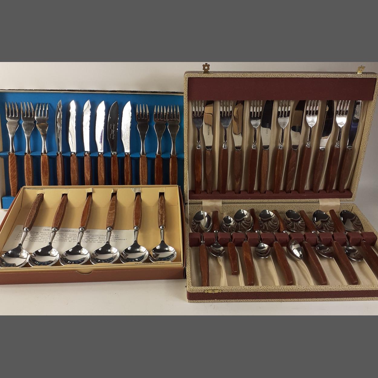 A canteen of GLASSWOOD cutlery with wooden handles plus a set of six GLOSSWOOD soup spoons and a set of BRUCUT fish cutlery for six