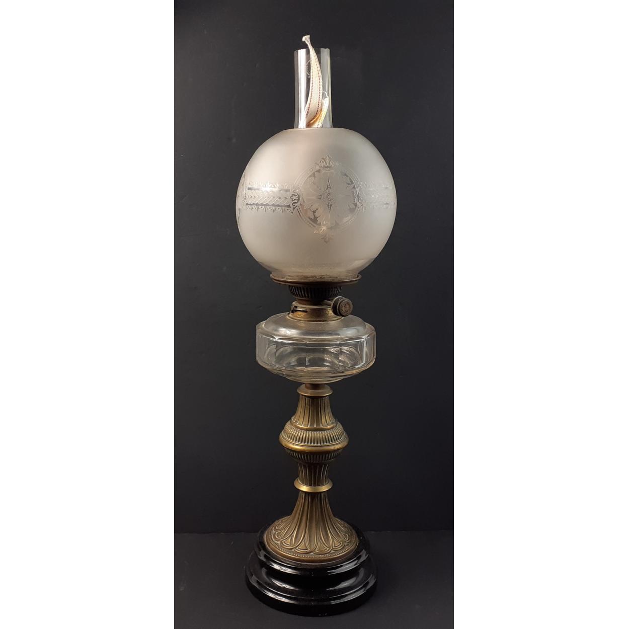 A beautiful oil lamp standing approx 65cm high with clear glass reservoir and an opaque etched shade with new wick. In excellent condition