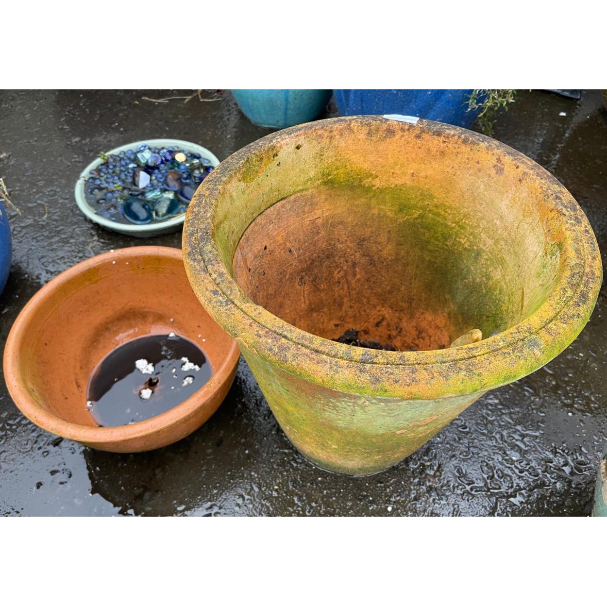 TWO TERRIFIC TERRACOTTA garden pots - one large (30cm tall) and the other smaller 12cm tall approx - to include a fantastic patina on the larger pot!